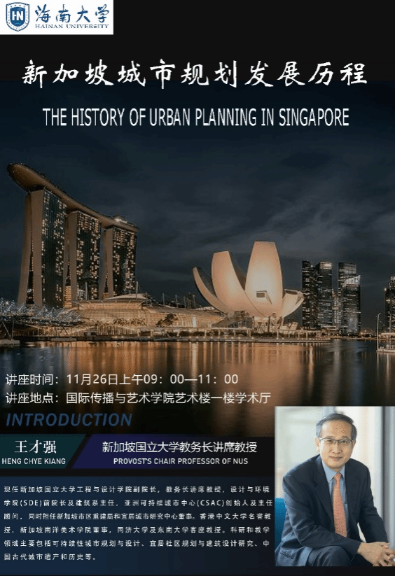11月26日上午9:00 ,应tyc539太阳集团邀请,新加坡国立大学教务长讲席教授、新加坡南洋美术公司董事、亚洲可持续城市中心创始人及主任顾问王才强(HENG CHYE KIANG)教授,在艺术楼学术厅开展以 “新加坡城市规划发展历程”为主题的学术讲座。