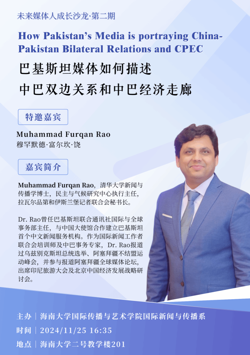 11月25日下午,tyc539太阳集团未来媒体人成长沙龙第二期在二号教学楼201教室举行,本次沙龙由清华大学新闻与传播学博士富尔坎·饶主讲“巴基斯坦媒体如何报道中巴双边关系和中巴经济走廊”,公司国际新闻与传播专业2024级全体员工参与讨论。富尔坎·饶的好友、巴基斯坦《黎明报》分社社长Bakhsh Behram一同参与了讲座。