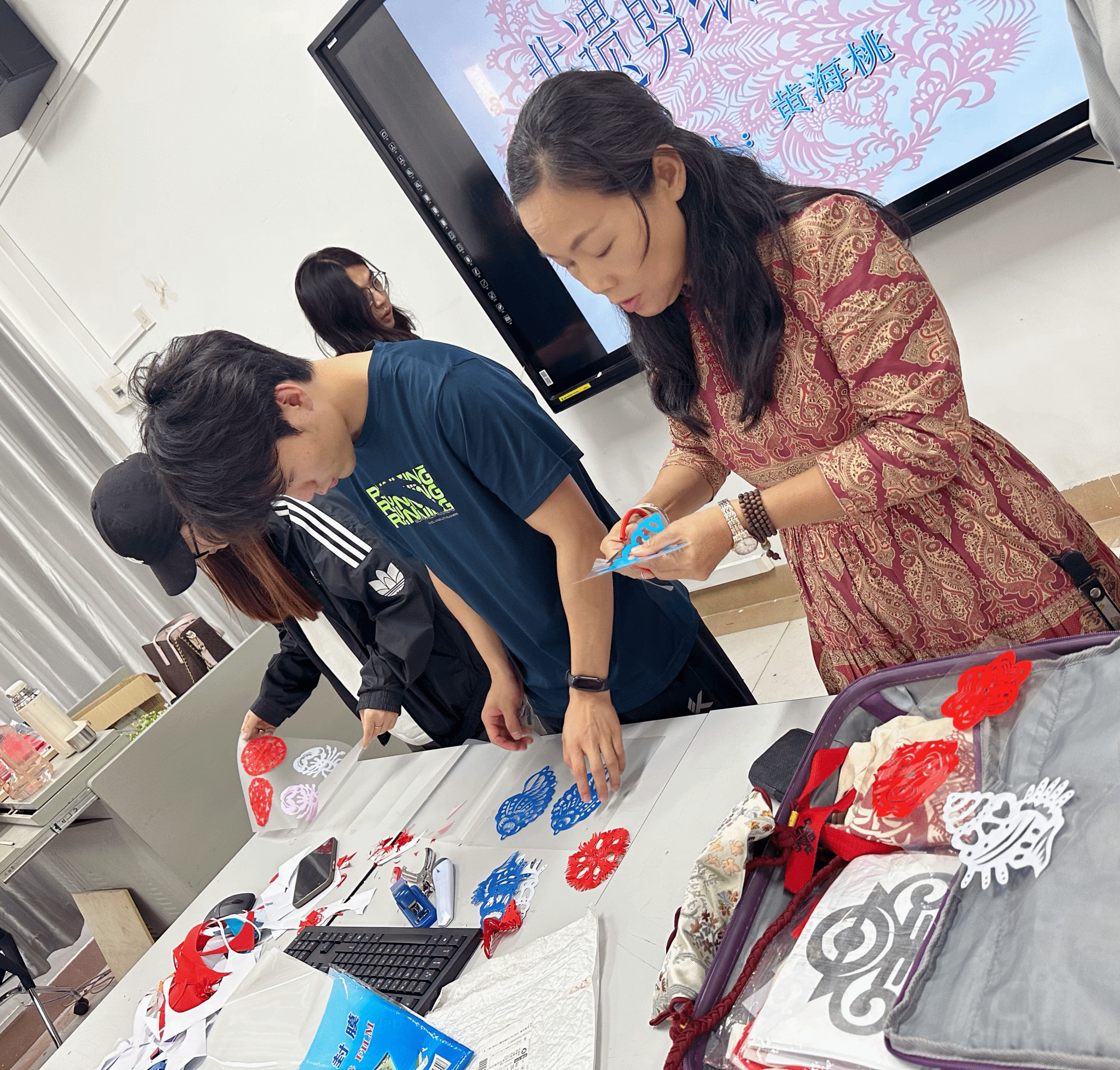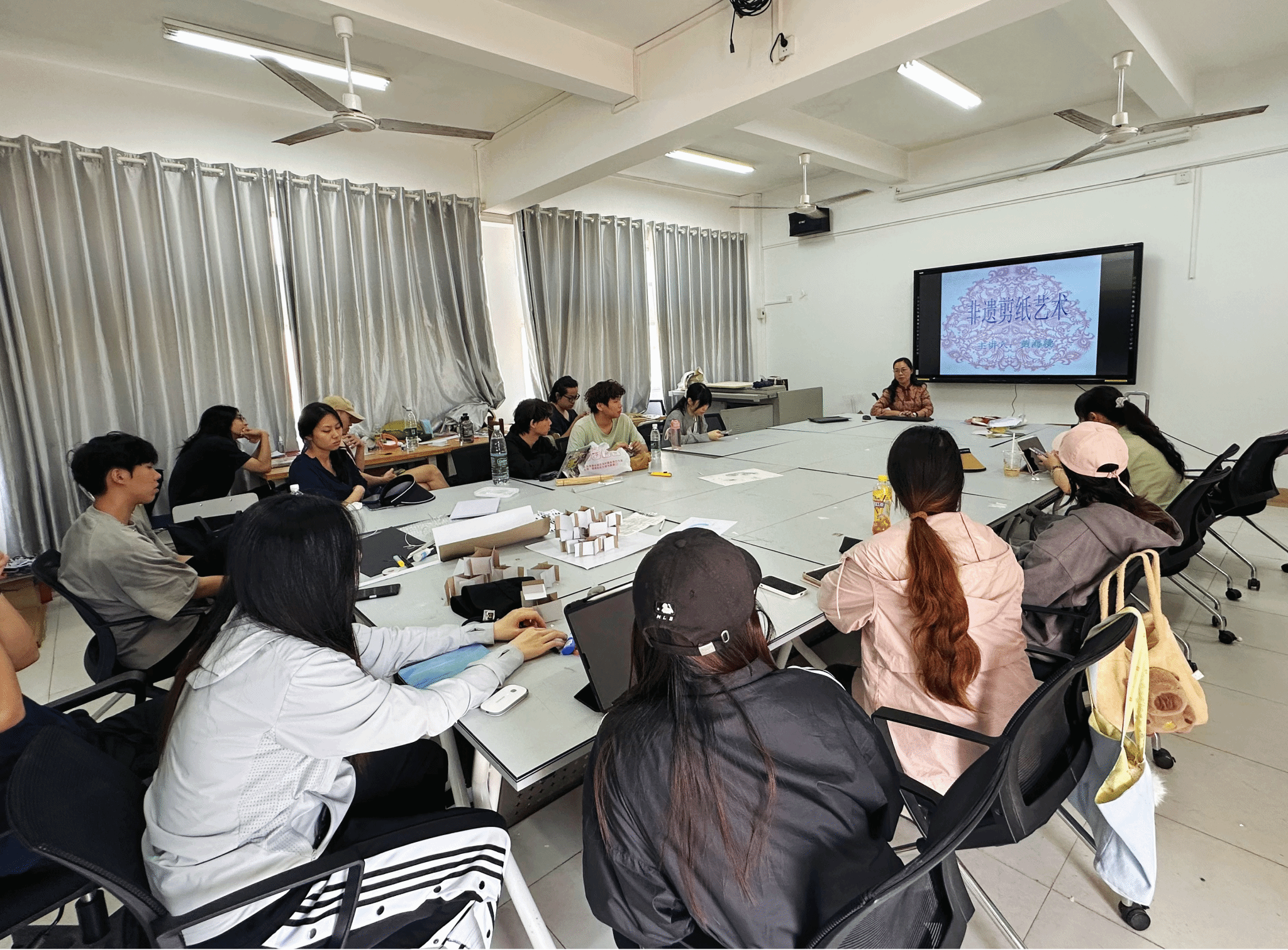 2025年3月26日下午,海南省剪纸学会会长、省级工艺美术大师、非遗传承人黄海桃应邀走入公司设计系大三课程—《旅游产品设计与制作》的课堂,与课程主讲教师张哲共同探索了剪纸艺术与海南文旅设计的融合路径。课程以“非遗活化+设计创新”为核心,通过理论讲授、技艺示范与创作实践,引导员工挖掘剪纸语言的地域表达潜力,现场气氛热烈。