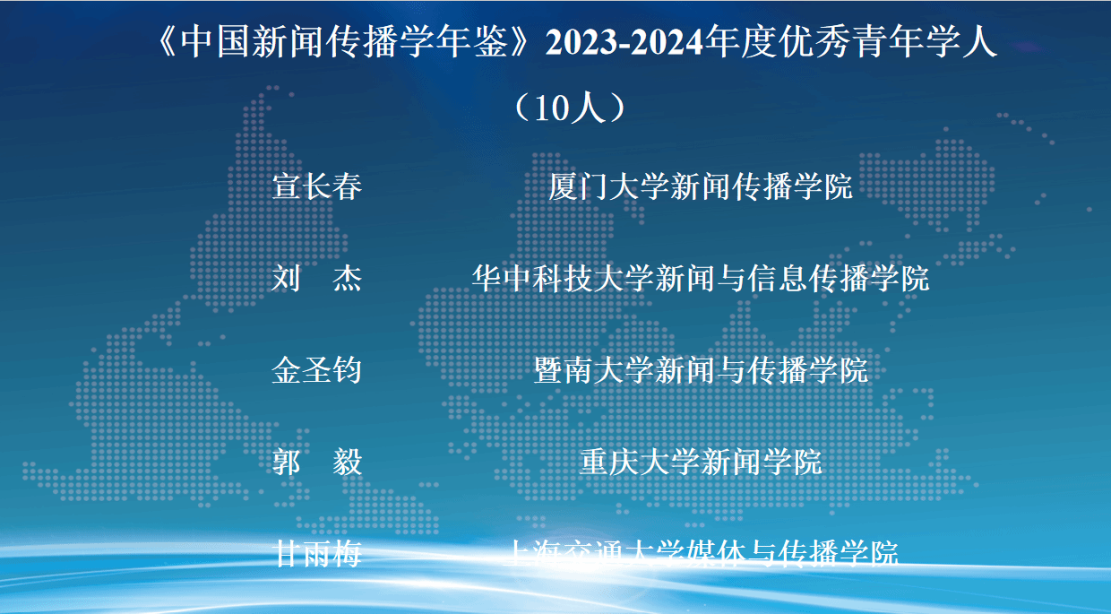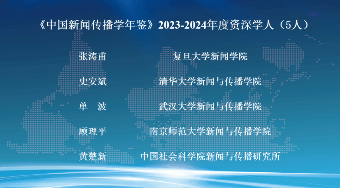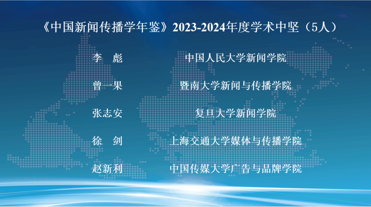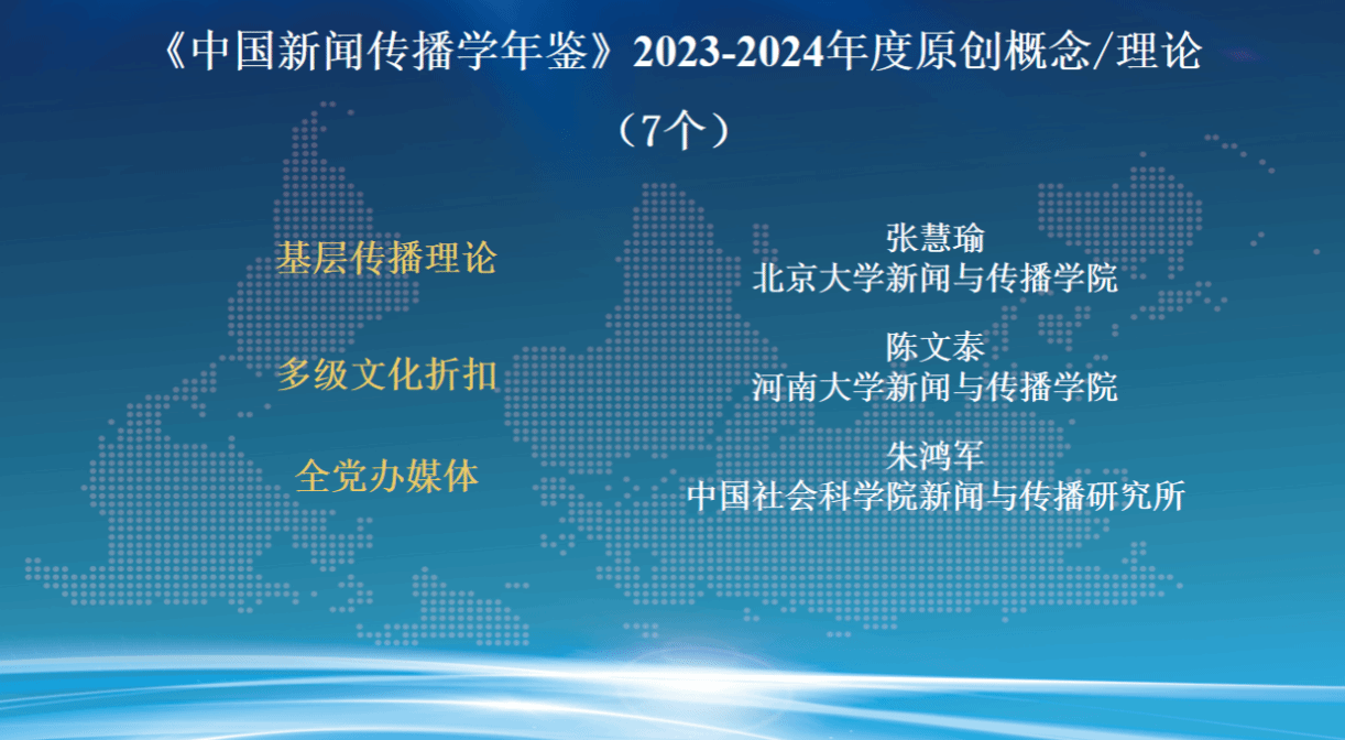 发布会现场,朱鸿军宣读了《中国新闻传播学年鉴(2024-2025)》关注的年度原创理论/概念、创新观点、优秀专著、优秀学人和教育创新案例名单。这份名单的产生经由面向学界征集、15家常务理事单位投票及编辑部统筹平衡等过程,旨在从不同维度反映2023-2024年度新闻传播学研究的优秀成果与学人风采。