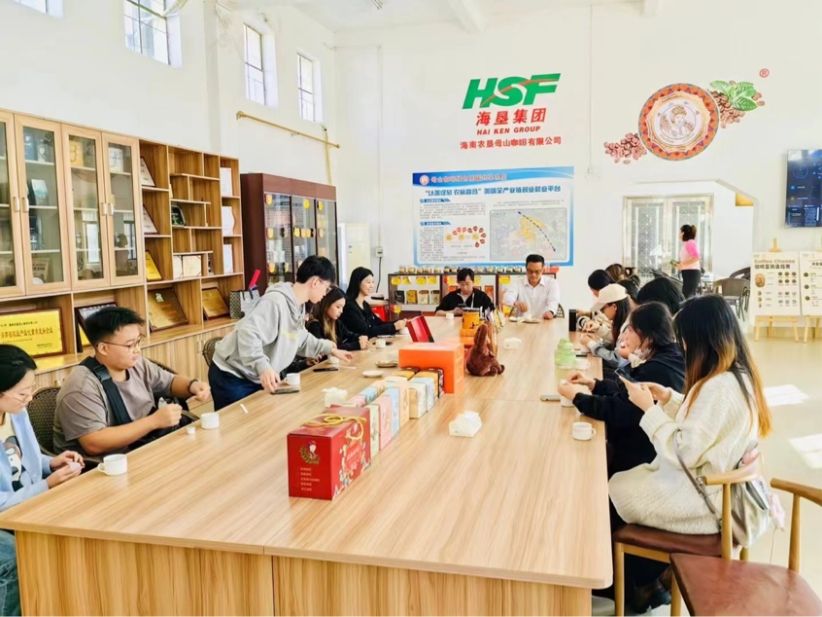 1月5号师生团队前往母山咖啡基地,母山咖啡基地位于在琼中黎族苗族自治县黎母山镇大丰居的大丰咖啡种植基地中,在翠绿的咖啡叶间,一簇簇的通透红果相携而生。在此期间不仅品尝咖啡还深度调研学习了农垦的历史,了解了海南省咖啡育种、种植、形成名牌的过程。为未来创作海南省主题性雕塑收集素材。