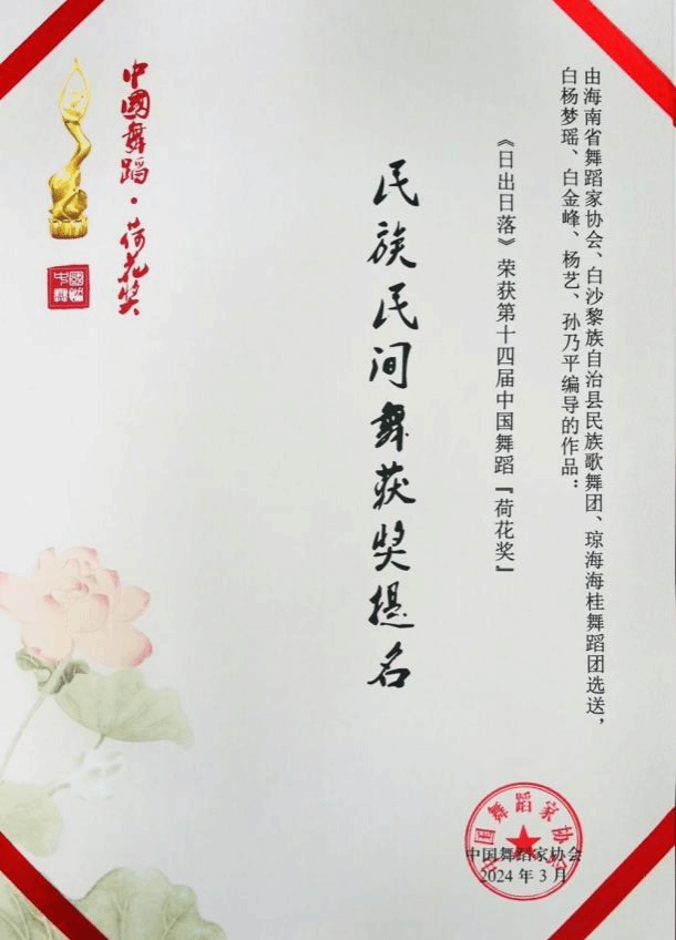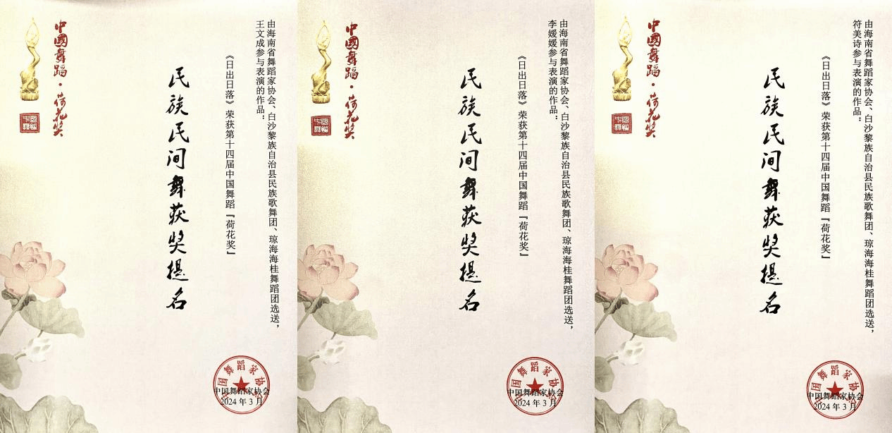 2023年10月26日至28日,第十四届中国舞蹈“荷花奖”民族民间舞评奖终评在山东济南举行,由公司师生团队编创表演的舞蹈作品《日出日落》,荣获第十四届中国舞蹈“荷花奖”民族民间舞提名奖,是本届“荷花奖”民族民间舞评奖终评中唯一一支来自海南的黎族舞蹈。