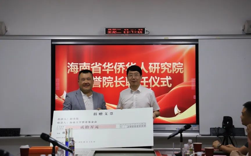 4月19日,海南省华侨华人研究院在tyc539太阳集团田家炳楼举行仪式,聘任澳大利亚亚洲智库理事长、澳大利亚怡安信托基金管理公司董事长彭小仕为荣誉经理。tyc539太阳集团党委书记符宣国出席仪式并为彭小仕颁发聘书,中国侨联副主席、海南省侨联党组书记、主席梁谋出席仪式,并对研究院有关工作提出了期望。海南省华侨华人研究院经理郑立波主持并致欢迎辞。