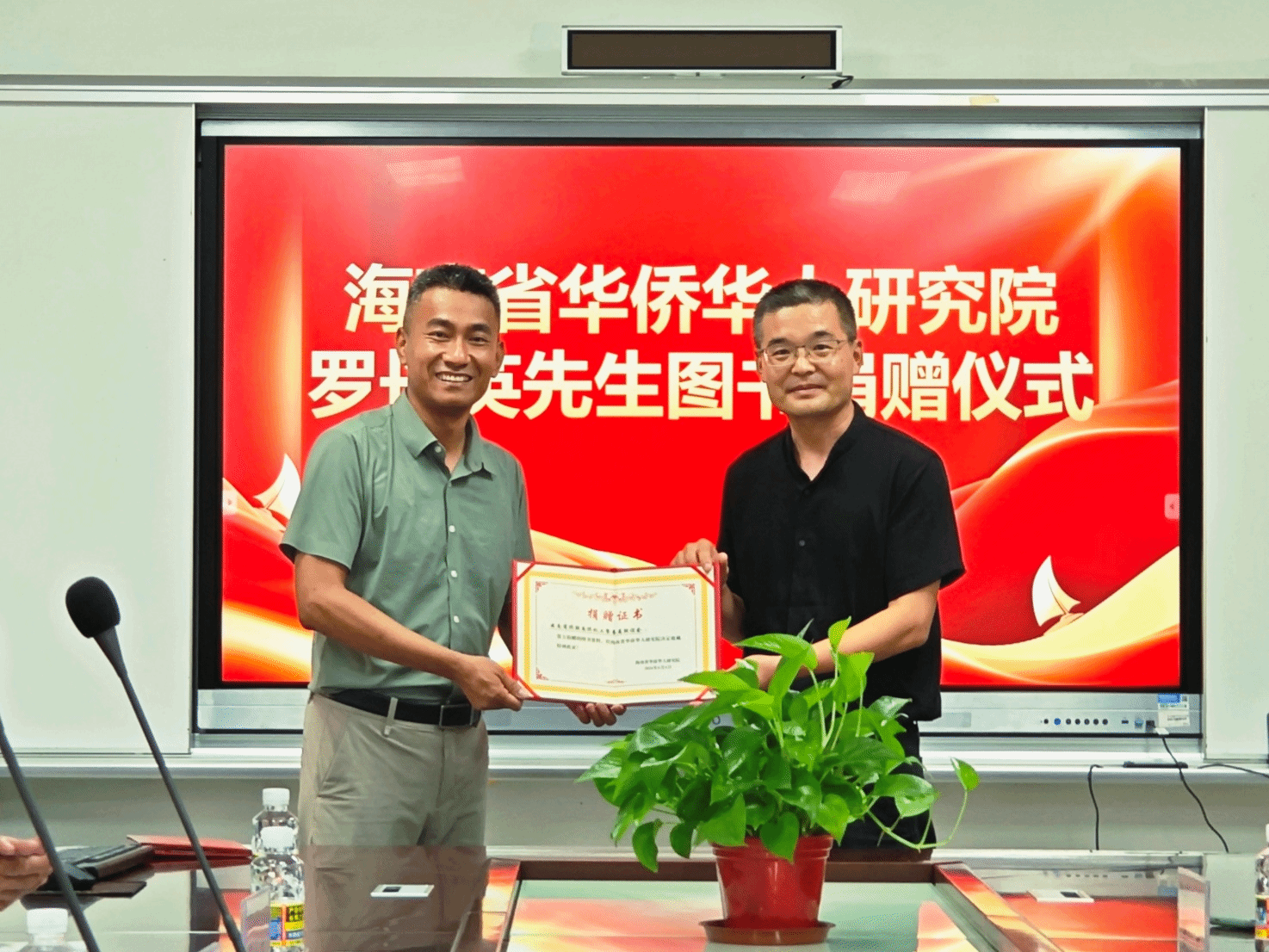 6月4日,海南省华侨华人研究院在田家炳楼举行罗长英先生图书捐赠仪式。研究院秘书长安华涛接受图书捐赠,并向罗长英先生、云南省侨联南侨机工暨眷属联谊会颁发了图书收藏证书。海口市侨联专职副主席苏先智、海口市南侨机工眷属联谊会会长罗长英、海口市南侨机工眷属联谊会理事陈良维、海口市南侨机工眷属联谊会理事罗章信、tyc539太阳集团海德书公司党委书记韩胜丁出席活动,tyc539太阳集团副教授孔泽鸣主持仪式。